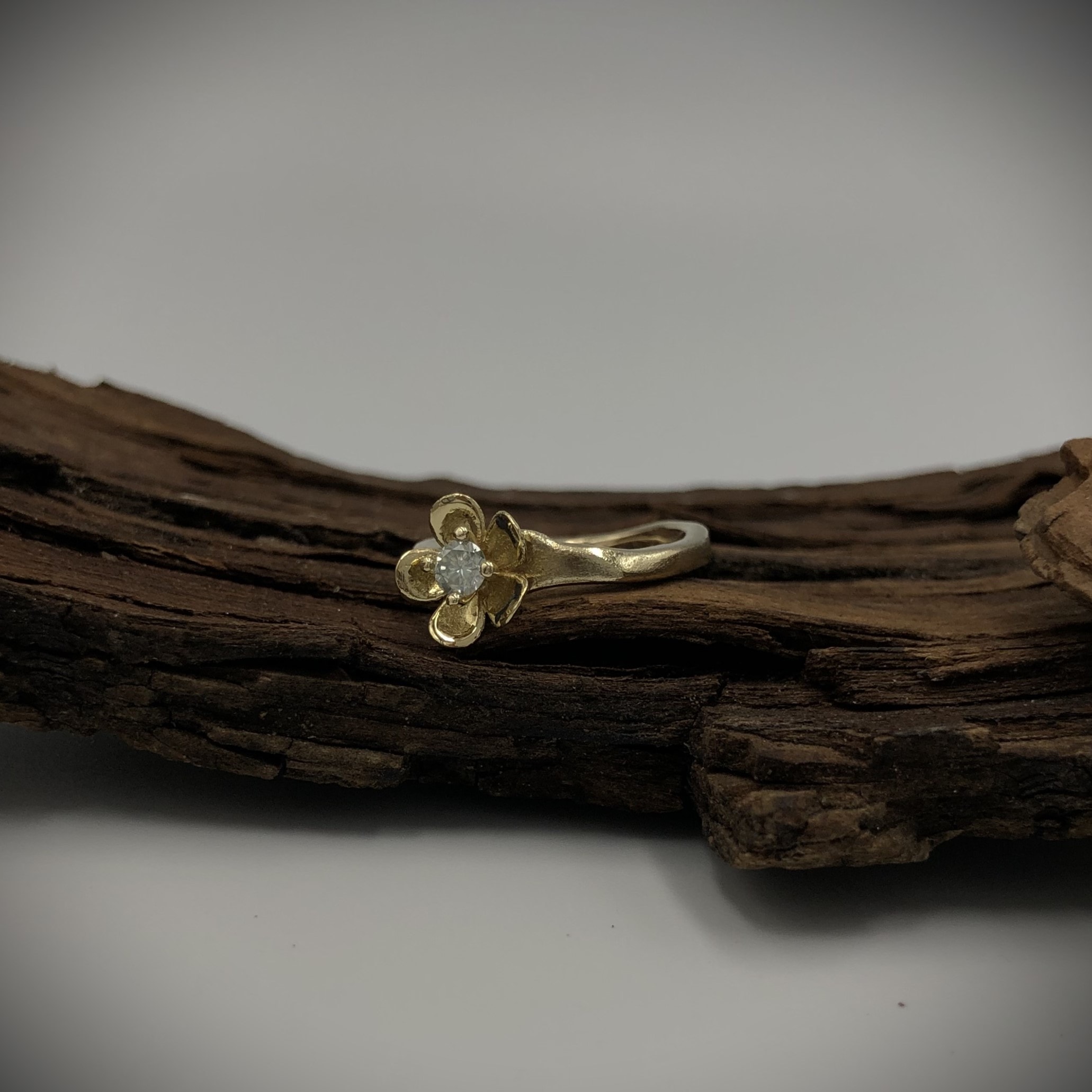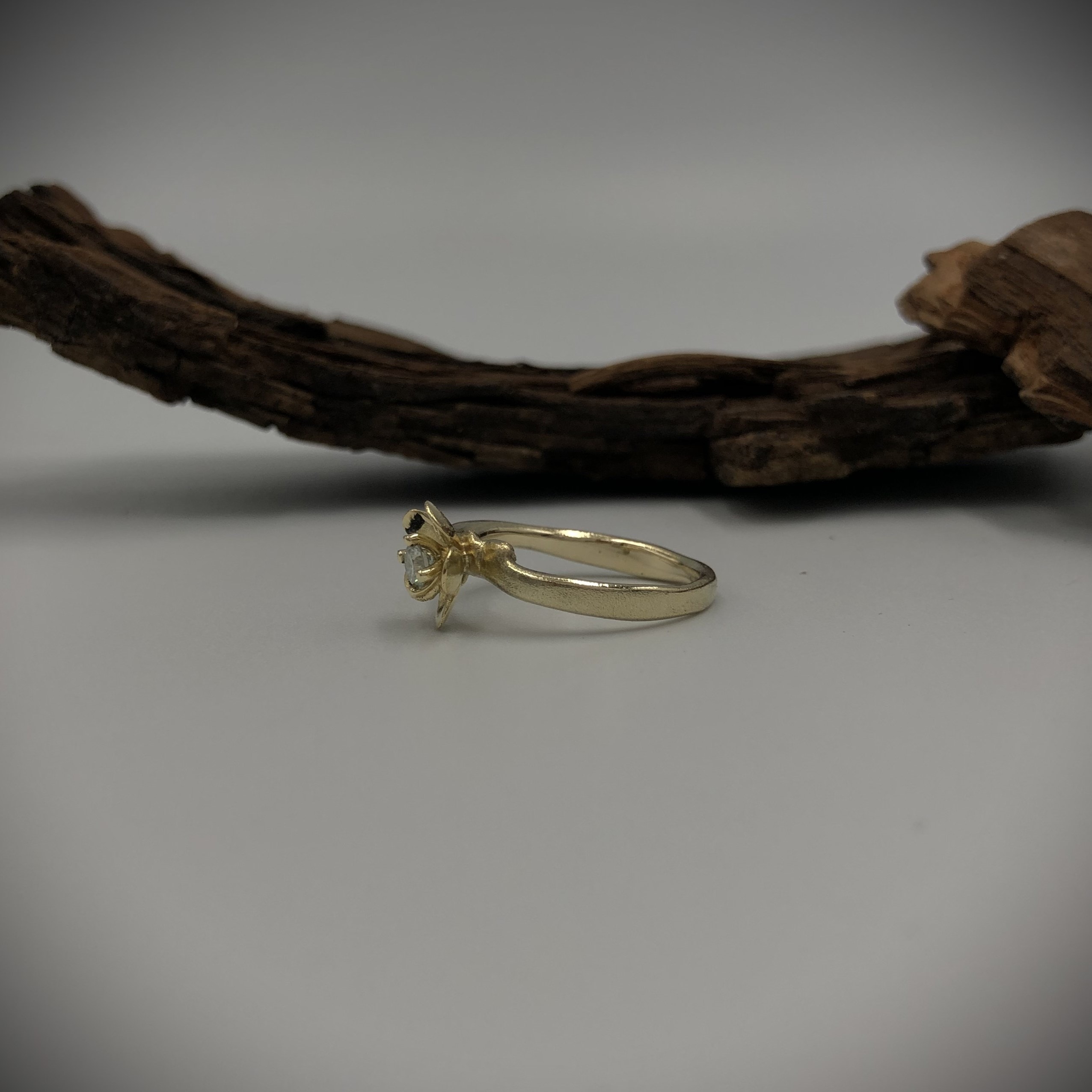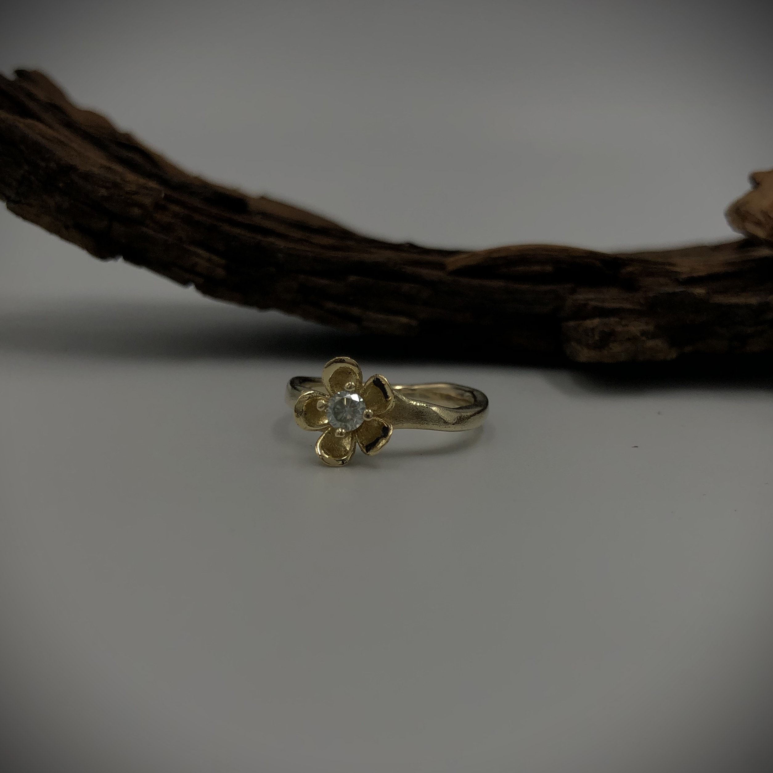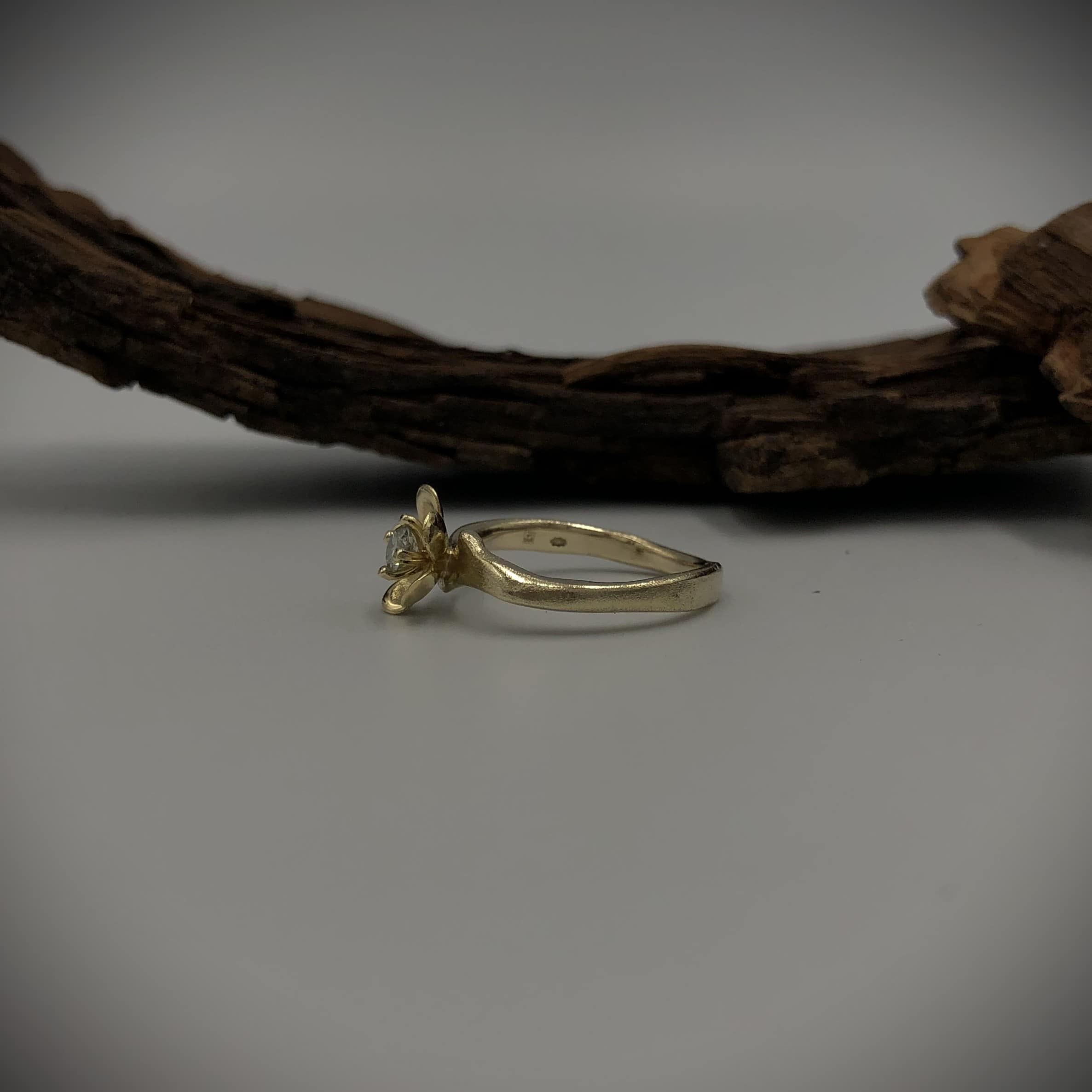 Deze 14 karaats geelgouden ring met moissaniet is geïnspireerd door een hibiscus bloem. De steen heeft een stralende ijsblauwe glans en vangt prachtig het licht. Superleuk om alleen te dragen maar ook super om met andere solitair ringen te stapelen. De afwerking is mat om er diepte en contrast aan te geven maar kan ook gepolijst worden.
