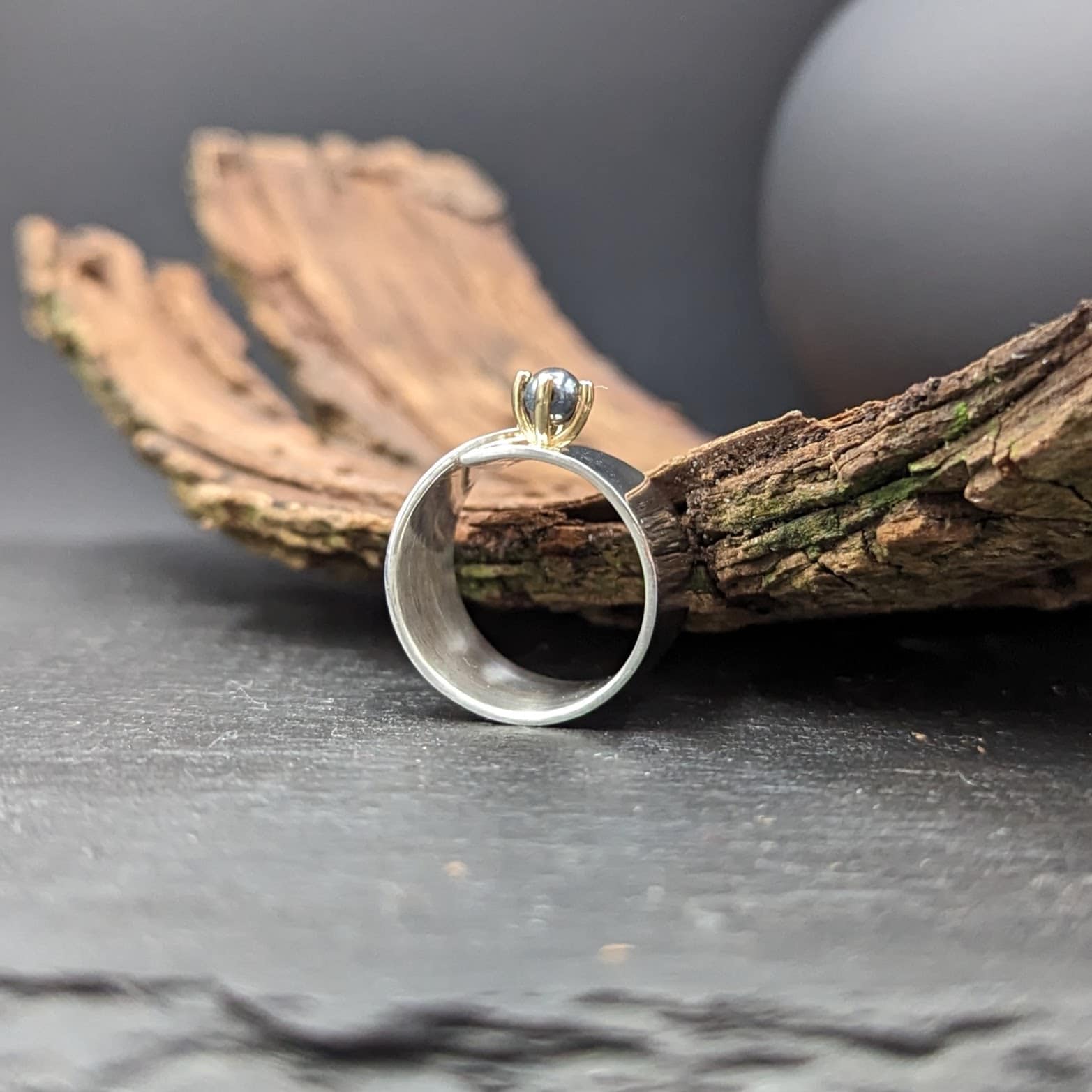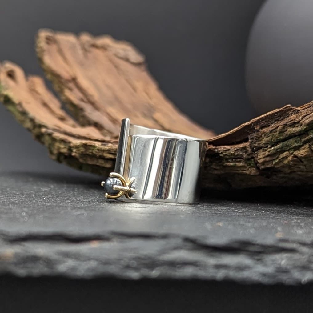 Op deze zilveren overslag ring zit een hematiet in een 14kt geelgouden chaton. De ring is breed maar niet dik waardoor hij heel comfortabel draagt.