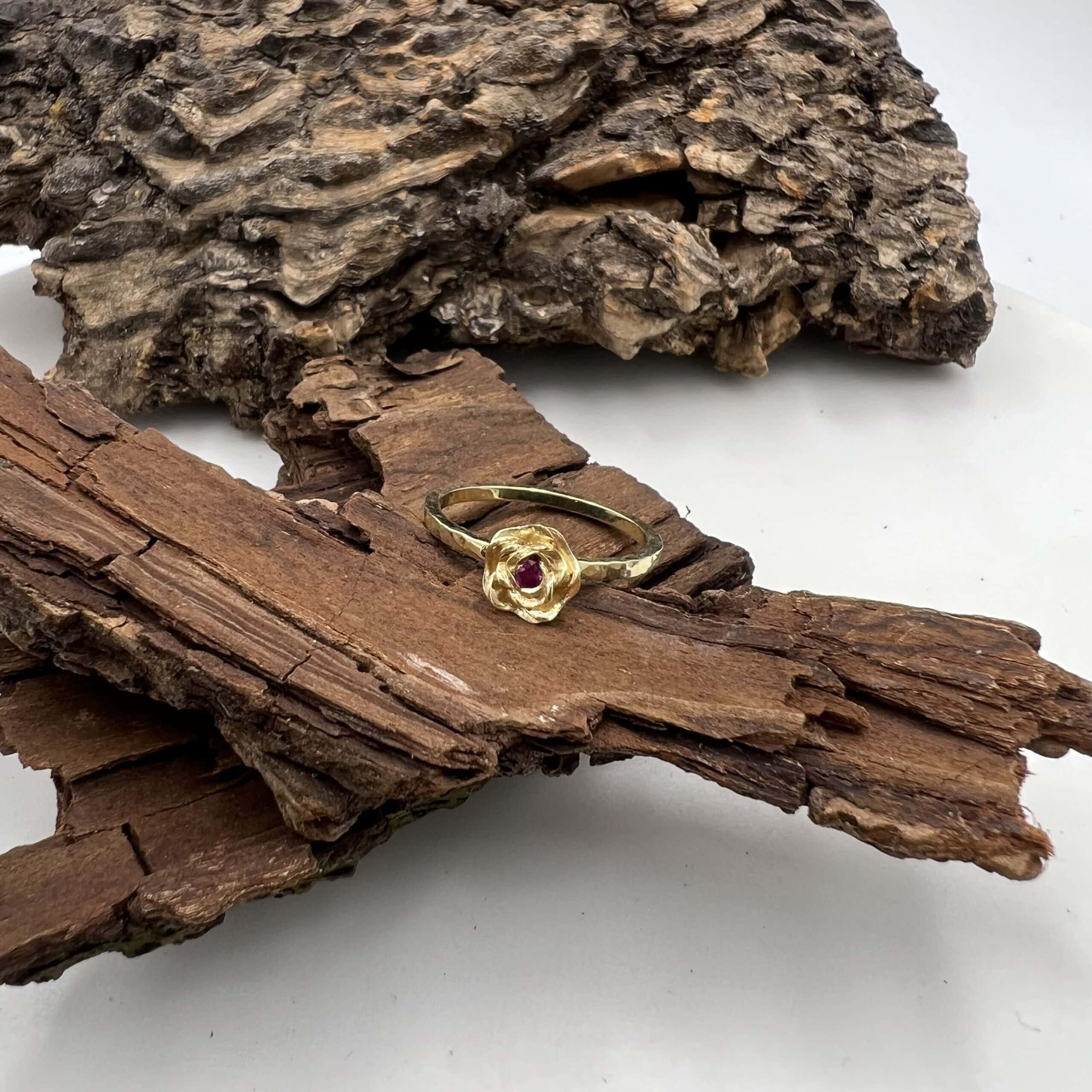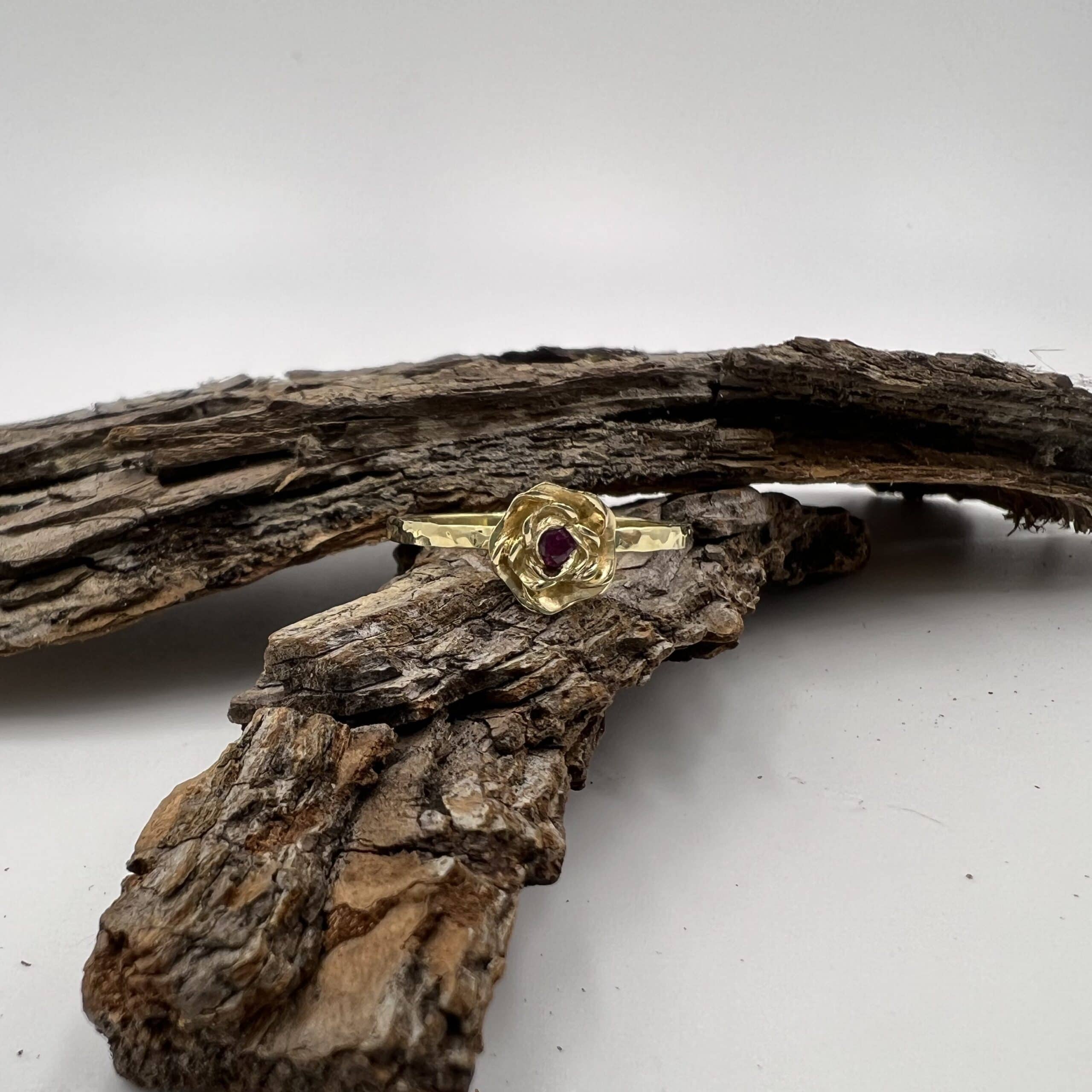 Het robijntje in het hartje van de roos geeft deze ring net dat beetje extra. Door de gehamerde scheen krijgt deze ring extra glans.